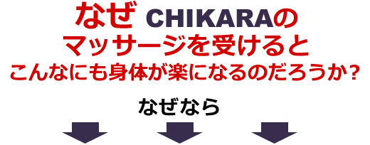 CHIKARAの技術の凄さは的確に筋肉のコリや張りを捉えることは当たり前で、それらを取り除いていくためのアプローチが的確なので、施術後の身体の軽さが本当に違います!