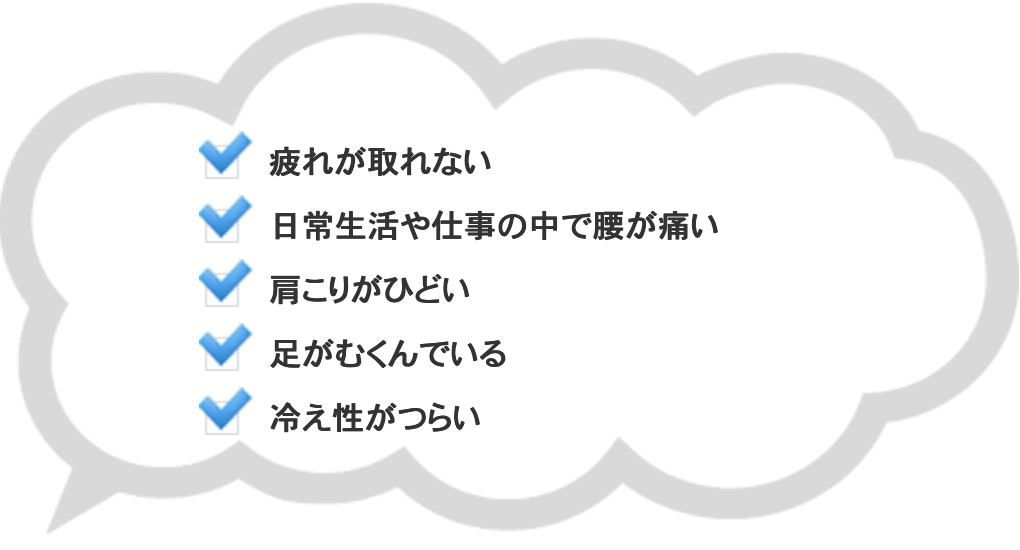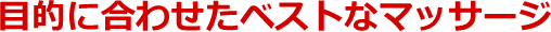 通われる方の症状は人それぞれです。同じ人間は誰一人いません。もちろん辛い部分を集中的に行いますが、経験のあるスタッフの判断でベストなマッサージをご提案しております。