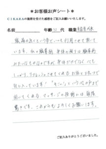 「そこッ!」という心の声まで聞いてくれるマッサージの技術には毎度驚きです。これからもよろしくお願いします。