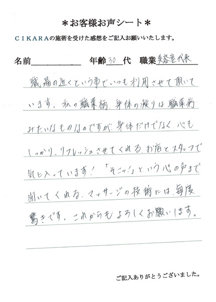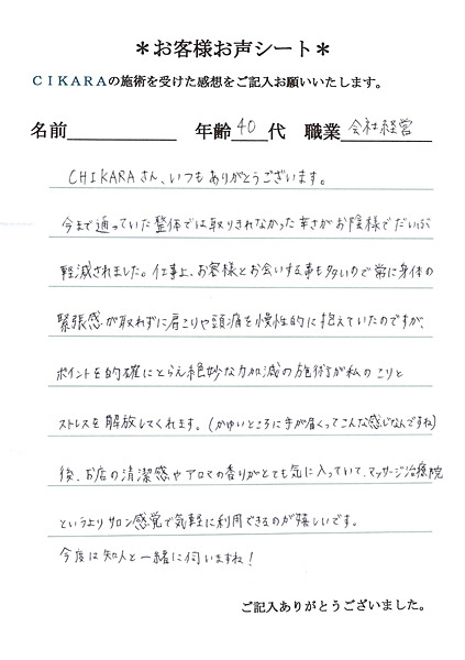 仕事上、お客様とお会いする事も多いので常に身体の緊張感が取れずに肩コリや頭痛を慢性的に抱えていたのですが、ポイントを的確にとらえ絶妙な力加減の施術が私のコリとストレスを解放してくれます。(かゆいところに手が届くってこんな感じなんですね)