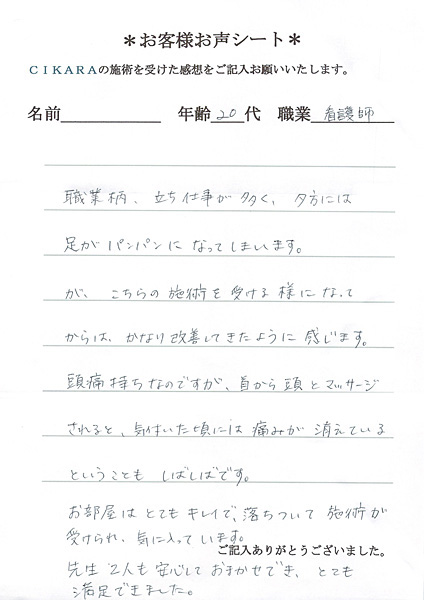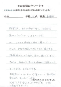 職業柄、立ち仕事が多く、夕方には足がパンパンになってしまいます。が、こちらの施術を受ける様になってからは、かなり改善してきたように感じます。